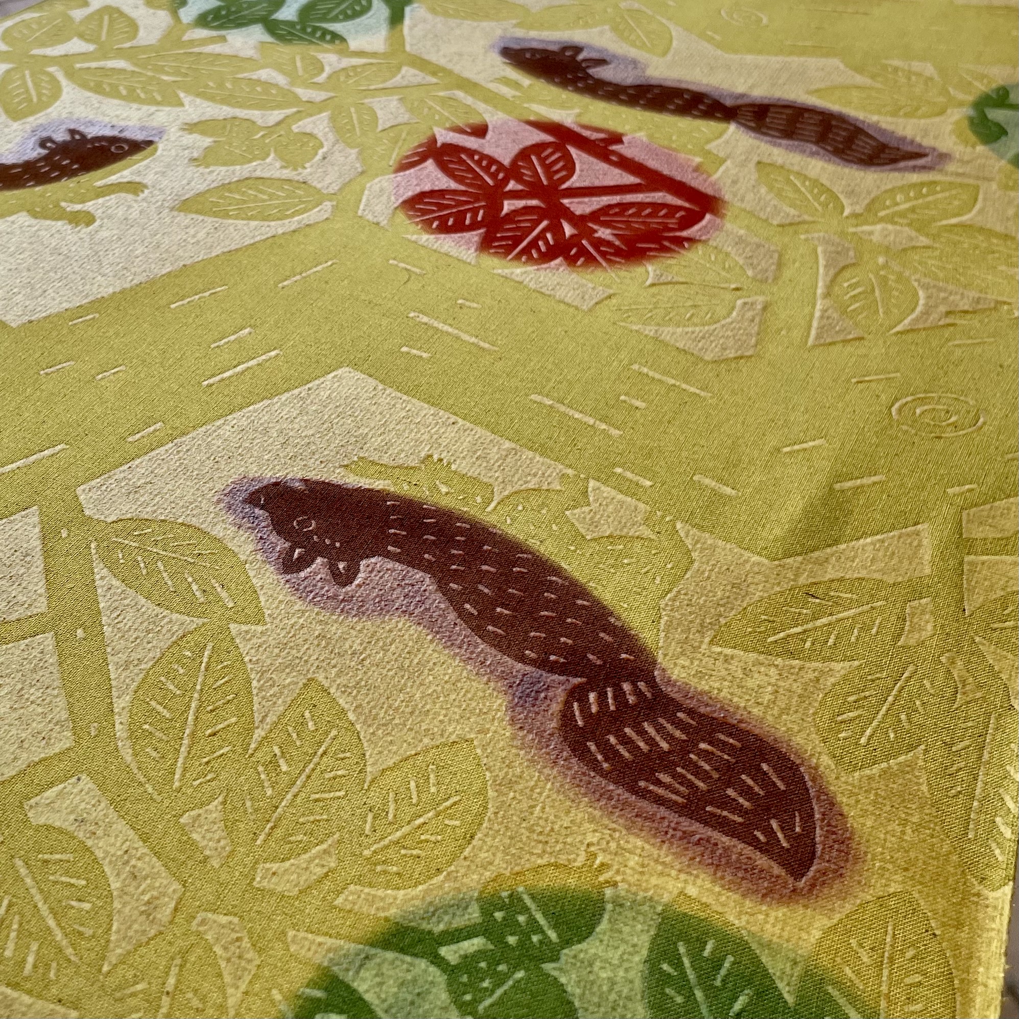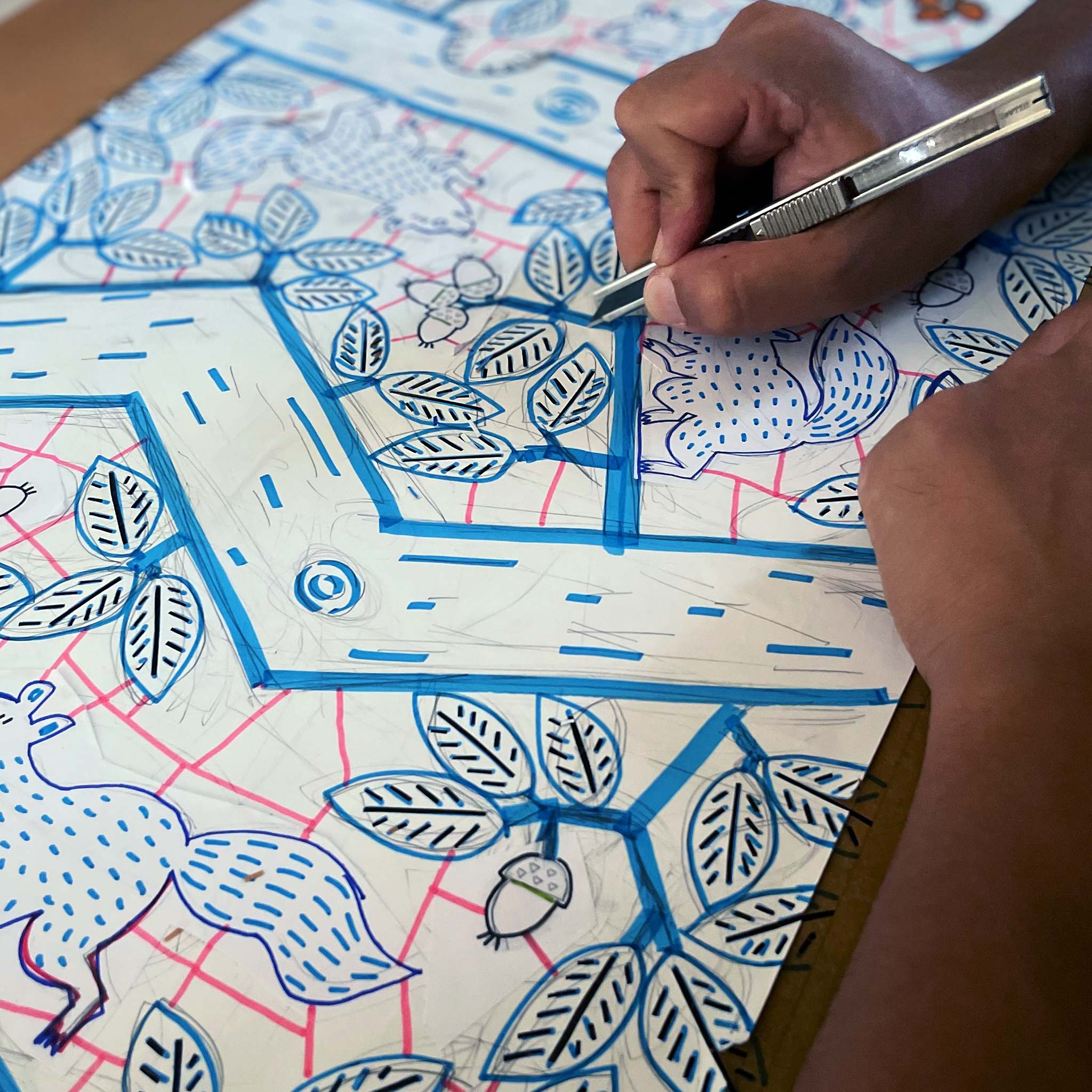 型紙を彫るときに忘れてはいけないのが「つり」です。写真 (左上)の中のピンク色の線を「つり」と言います。これは型染めの制約の一つで互いに繋がらないカタチは型紙から抜け落ちてしまいます。「つり」にはカタチどうしを繋げ、位置を保つ重要な役割があります。それに「つり」を図案の中にうまく取り入れることで独特な表現がうまれるように思います。よく見ると小魚たちはみんな繋がっていますね!
