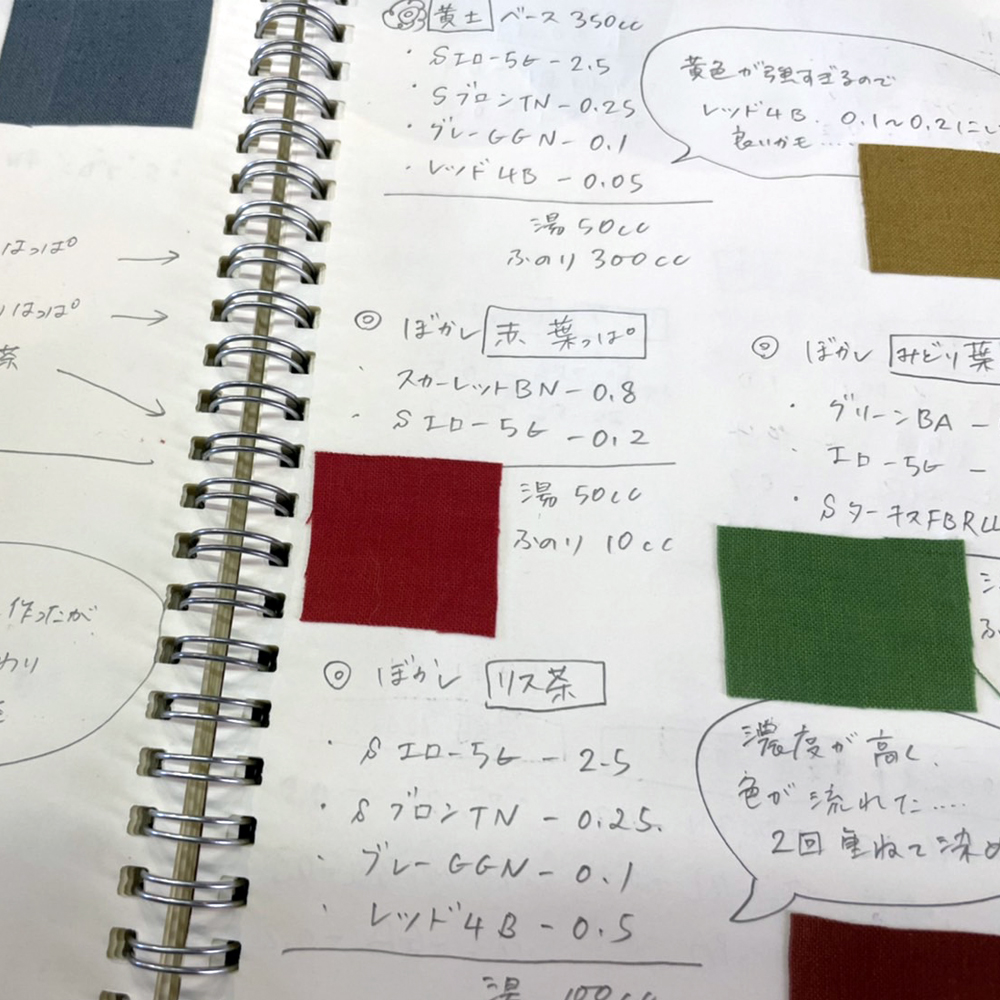 kata kataの手ぬぐいは、自分たちで染めたサンプルを元に注染の職人さんによって染められます。過去の色レシピを見返し、あの時は成功だった、あれはちょっとダメだった、今回はこんな挑戦をしてみよう、いや、やっぱりやめよう、と堂々巡りすることが多々あります。理由は注染特有の「差しわけ」にあります。異なる色を染める場合、色ごとに糊で土手を作り、その部分に染料を注ぎます。(→参照)染料を同時に注ぐ事で「ぼかし」や「にじみ」の表現が可能となるのですが、この際に混ざる染料の色や相性にとても気を使います。kata kataの色レシピには15年に渡って試行錯誤して集めた色のデータが書かれています。新しい色の組み合わせは完成品を見るまでドキドキするようです。試行錯誤は続いています。