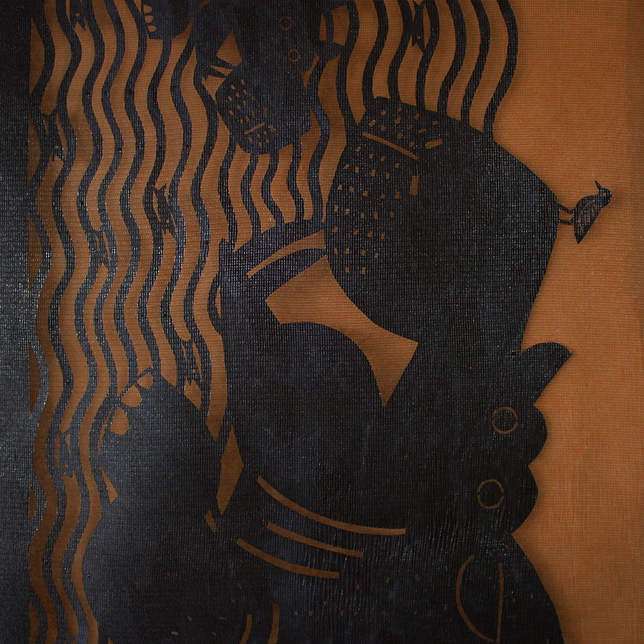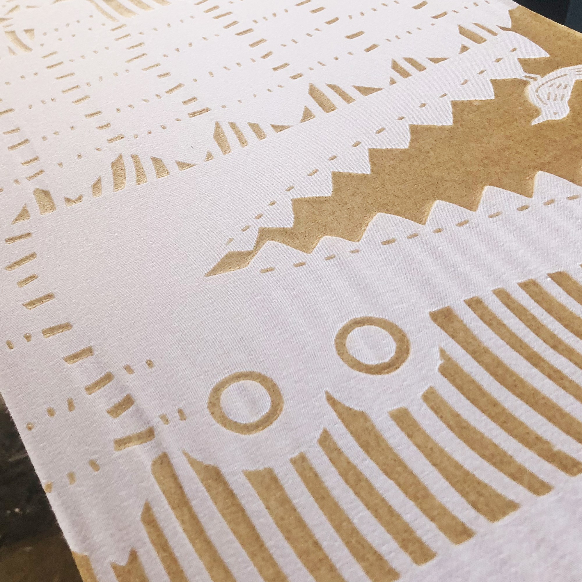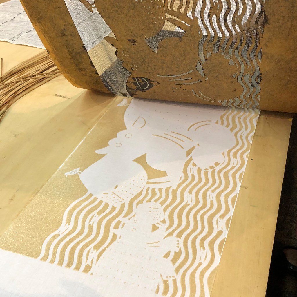 布の上に型紙を置き、糊(のり)をヘラで均一にのばします。ヘラで糊を伸ばす様子は、どことなくケーキをデコレートしているパティシエのようです。型紙をそっとはがし、カタチが鮮明に見えた時、色の構成を考える楽しみが本格的に*始まります。