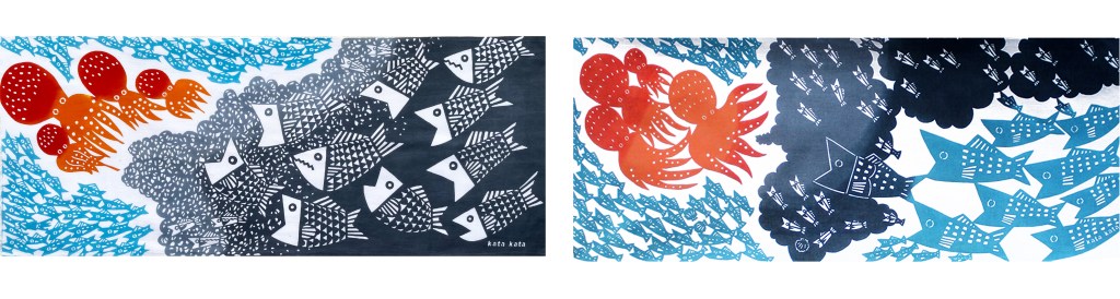 「たこ」をモチーフにした手ぬぐいは10年程前に一度制作しています (左下)。型紙がボロボロになり、長い間生産中止となっていました。同じ図案の型紙を彫り直すよりも、違うものを作りたい気持ちが勝るようです。kata kataにはそういった理由から、消えていった手ぬぐいが多くあります・・・。2021年の「たこ」は前作とは構成を変えたようです。まずはたこが吐き出したスミの彫り方を整理したことで、登場人物たちに目が向くようになりました。モチーフの動きが分かりやすくなったのは、赤・水色・紺を色のかたまりで配置したことにもありそうです。