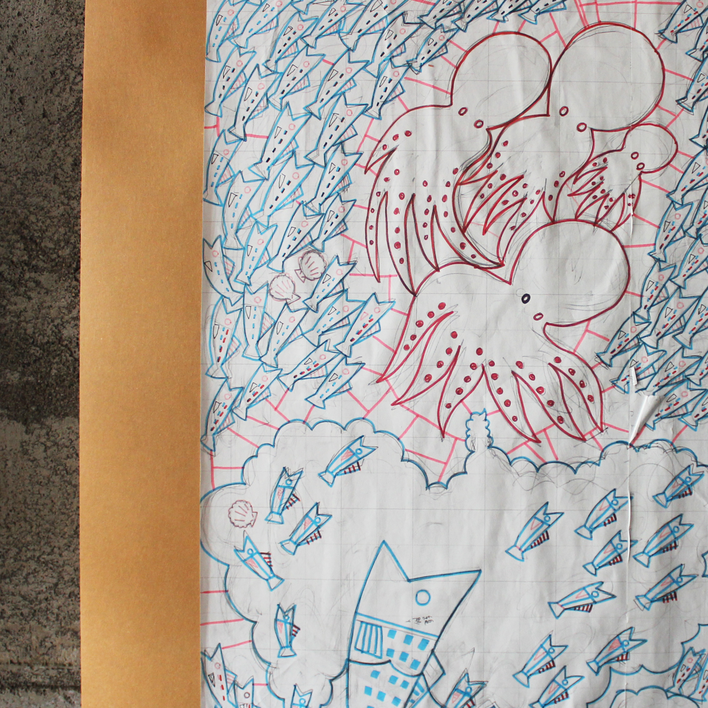 「たこ」(右下)一見すると正義感満載のたこが小さな魚を守るために勇敢に立ち回っている様ですが、実際は魚群に驚いてスミを吐き、自分の吐いたスミにも驚いてしまっているという場面です。 基本登場生物みんな焦った様子です。生きるって大変。