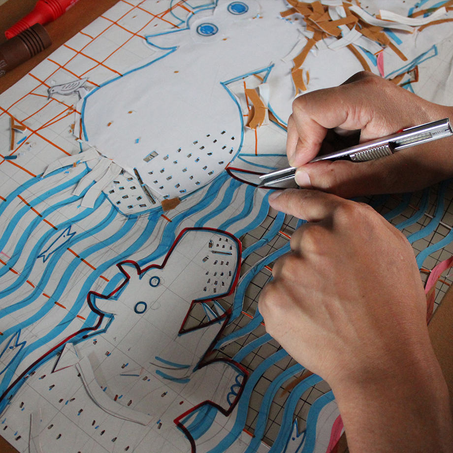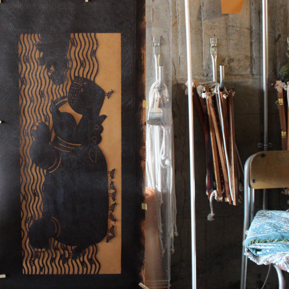 *下絵の段階から色を考えているケースもありますが、実際に染色される部分・カタチが見え始めるこのタイミングで頭の中でさまざまな色の組み合わせを想像をしながら作業を進めていることが多いようです。